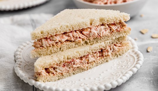 Sándwich de pollo desmenuzado con pimentón salteado y mayonesa. Liviano, pero con carácter.